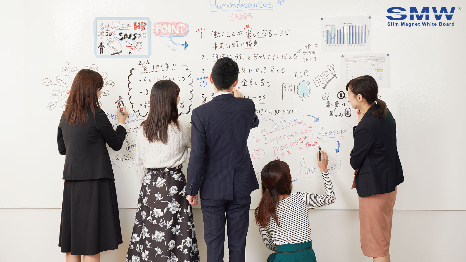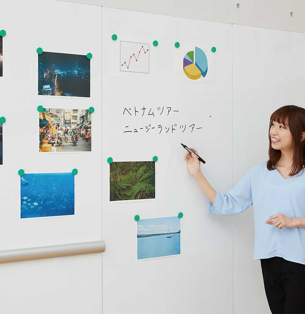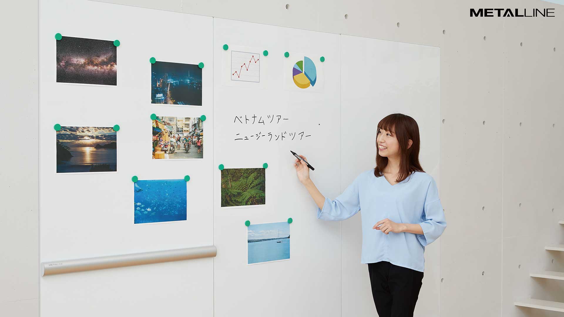 - 壁に貼って横でも縦も使える、複数枚を並べて使う、立て掛けて使う等、様々な会議形態に柔軟に対応できます。