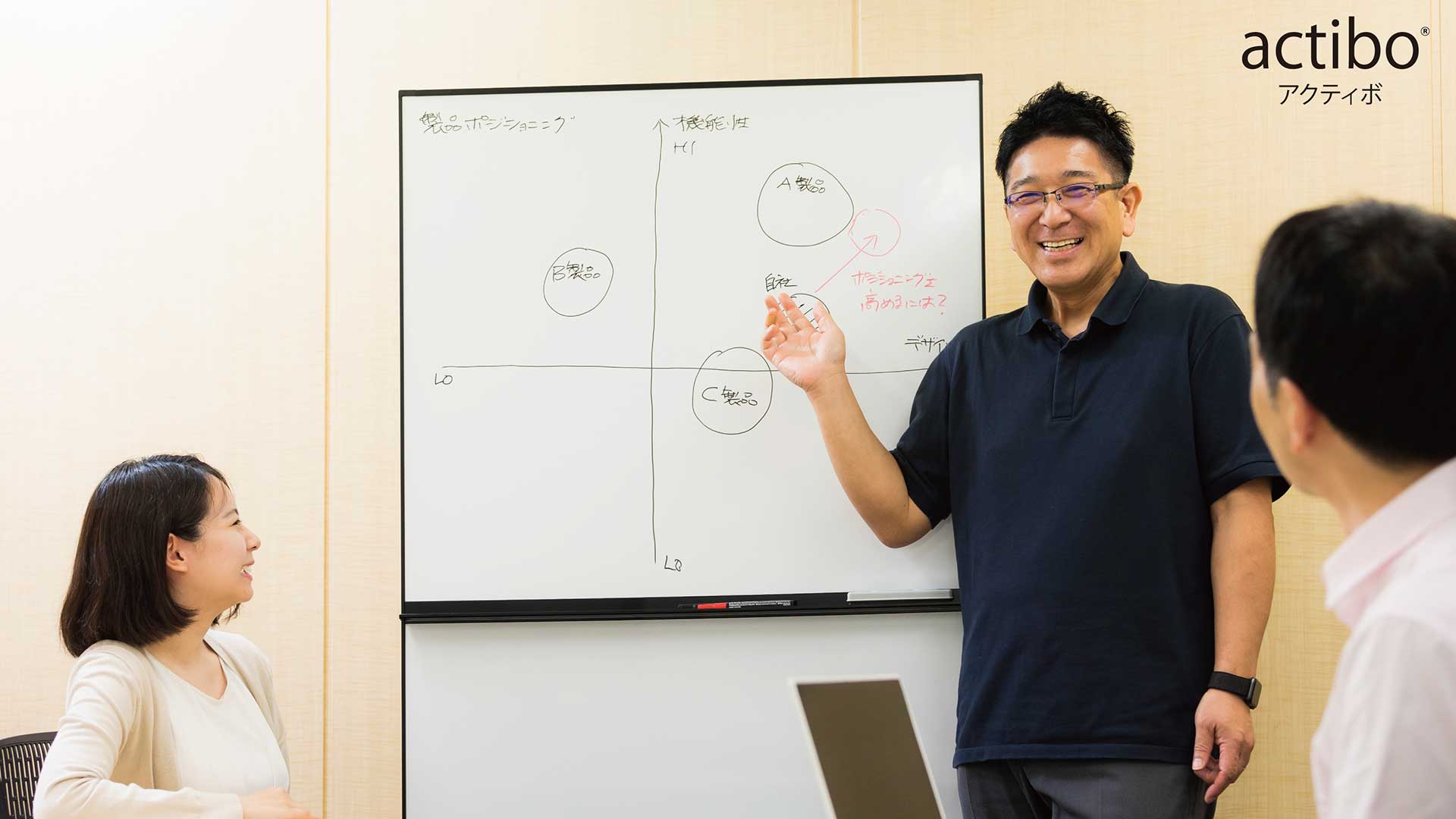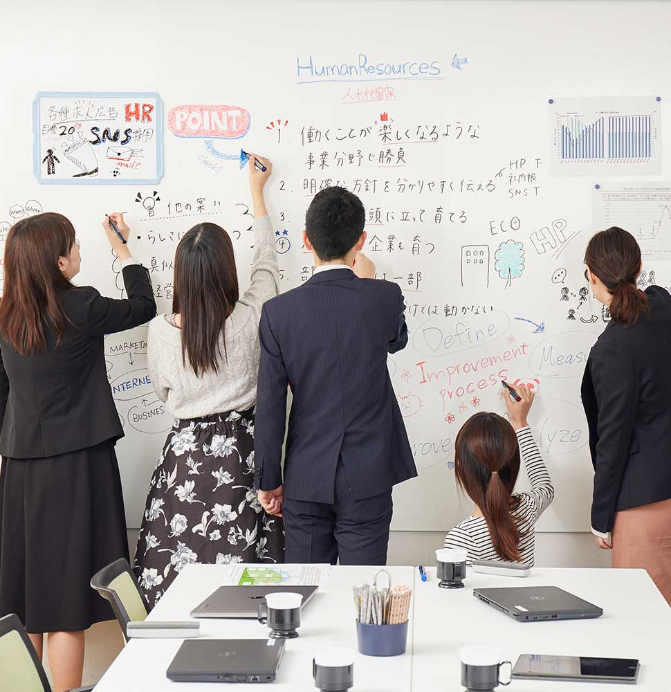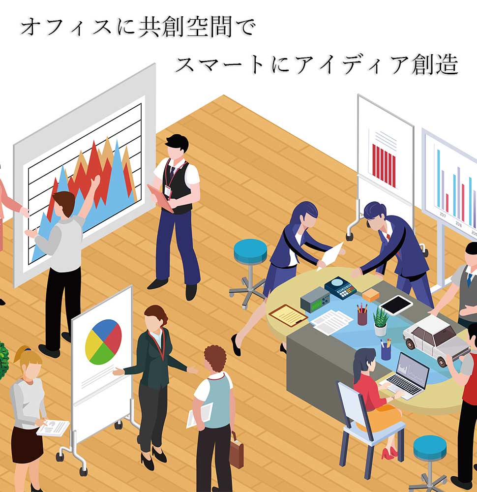 - 壁に貼って横でも縦も使える、複数枚を並べて使う、立て掛けて使う等、様々な会議形態に柔軟に対応できます。